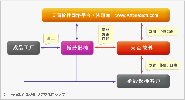 对于婚纱影楼,天画软件是婚纱影楼增值服务的推进剂和利器,通过软件影楼可以足不出户的整合资源,简化操作流程,大大降低成本,提高效率。将客户从看样,订购,制作加工等流程一次性用软件来实现,方便、准确、及时。主要用到的功能:资料管理、虚拟展示,客户管理,订单管理,库存管理,成本管理等。